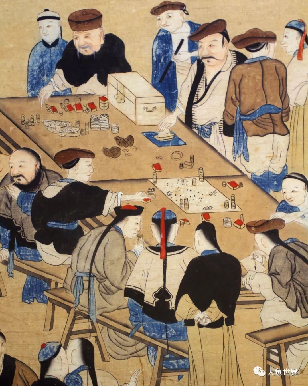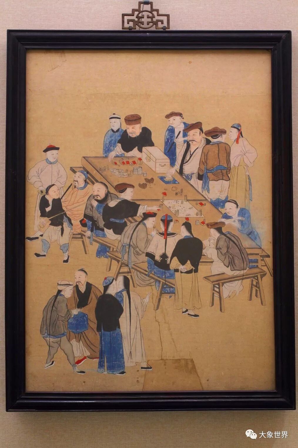 这幅法国回流的清代的赌坊画放在澳门古玩店实在太合适了,哈哈,尺幅不大,但在不到3平尺的空间生动描绘了各具神韵和个性色彩的二十个赌坊人物,博彩业,自古以来就是极具人气的产业,呵呵。但从画中人物各种微妙表情看,即便您在澳门合法的参与博彩,也要适度,小赌才怡情哈。