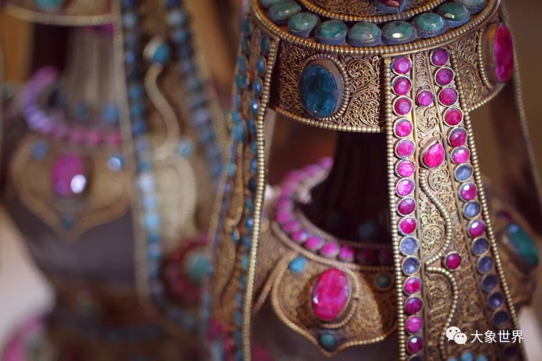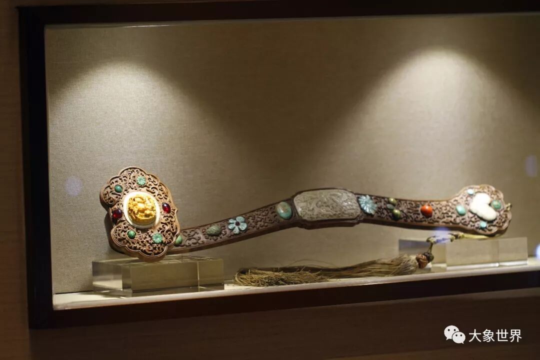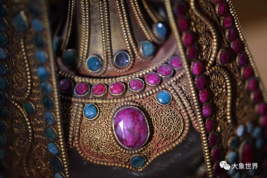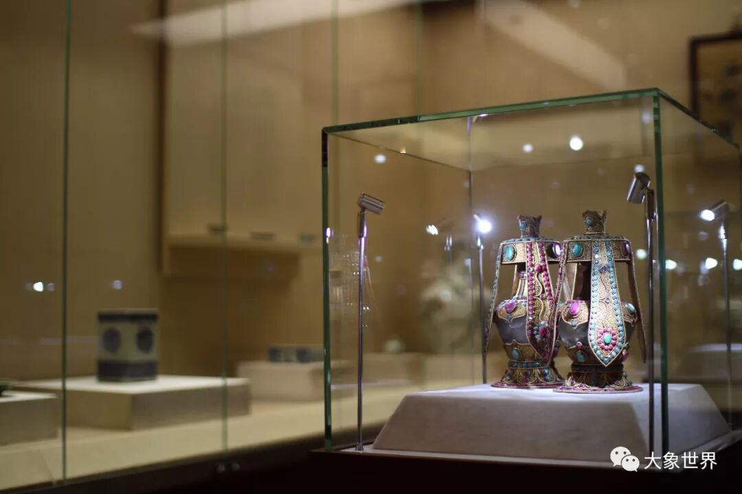 中国根开幕大展上的一件重要藏品,西藏佛教用来供奉的宝瓶。藏传佛教中,用来“金瓶掣签”确定活佛转世灵童的,就是这样器形的金瓶。这对宝瓶瓶腹是水晶胆,外包铜鎏金嵌红、绿宝石,珠光宝气,极为绚丽夺目。