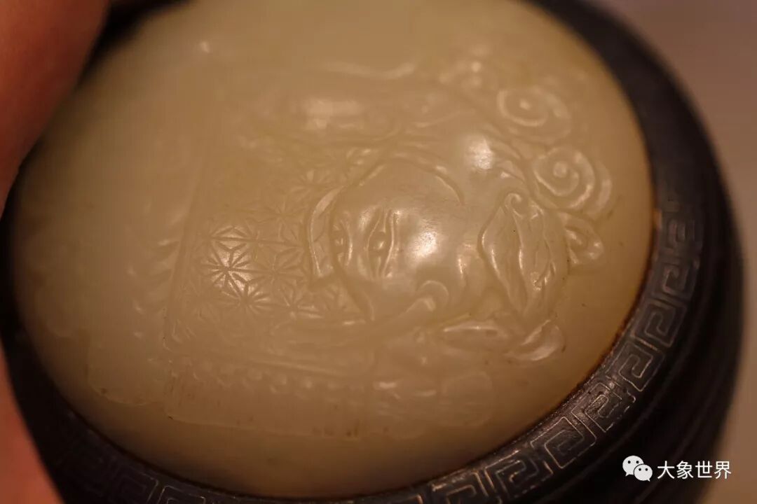 大象一直以来都是吉祥、喜庆的祥瑞象征,《汉书·王莽传》:“天下太平,五谷成熟”。太平有象即天下太平、五谷丰登的意思,到了当代,“太平有象”题材更是屡屡作为重要国礼馈赠外国领导人。这件清代紫檀嵌银线镶白玉「太平有象」盖盒是一件绝佳的案头雅玩,盖盒镶嵌上等的和田玉,玉质洁白盈润,玉雕的大象,更是生动可爱。