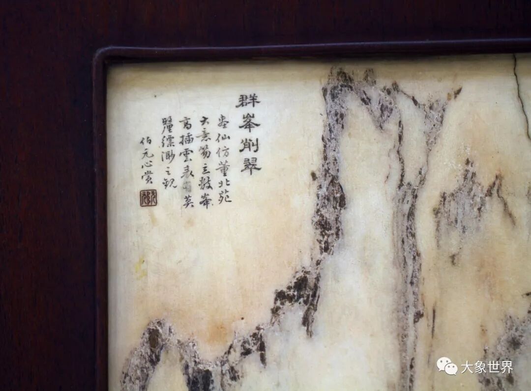 阮元(1764-1849)字伯元,是清代著名的著作家、刊刻家、思想家,在经史、数学、天算、舆地、编纂、金石、校勘等方面都有着非常高的造诣,被尊为三朝阁老、九省疆臣,一代文宗。落有阮元款的酸枝大理石群峰削翠图挂屏,极具人文气息的一件文房挂件,人见人爱的藏品。