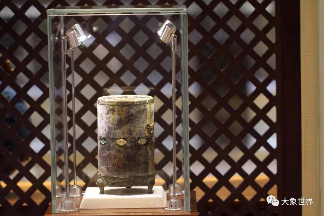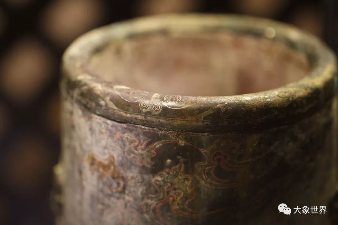 中国根的开幕展中,汇聚了相当一部分精彩的高古艺术品,正所谓追根溯源,把根留住,这件汉代的黑漆彩绘铜错银扣器,远远看去就气场强大,每一个细节都向人们展示着两千年前的一代盛世。