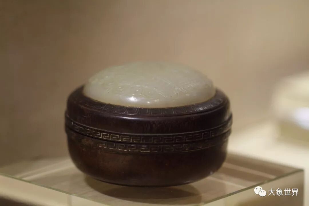 清 紫檀嵌银线镶白玉「太平有象」盖盒