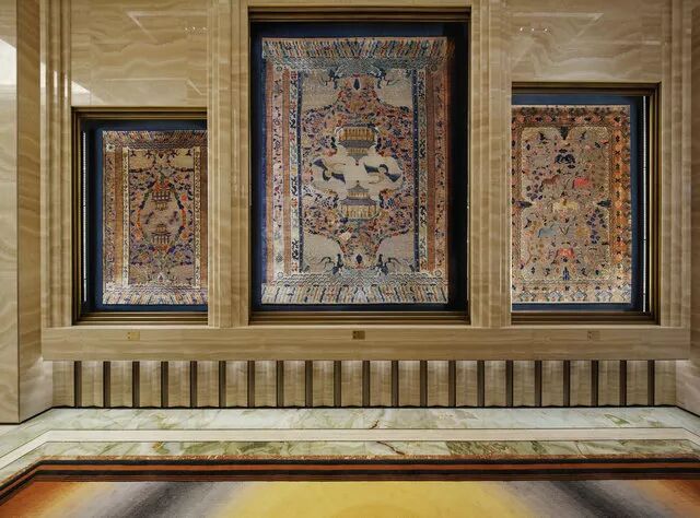 在酒店大堂首次亮相亚洲的 28 张来自 18 – 19 世纪的中国御制地毯,其中的绝大部分都是清代皇宫的精美装饰,其中一件亮点藏品为清乾隆御制龙纹地毯《天龙图》地毯为紫禁城宁寿宫所制,朋友们在本次艺术之旅中都能亲身体验得到。