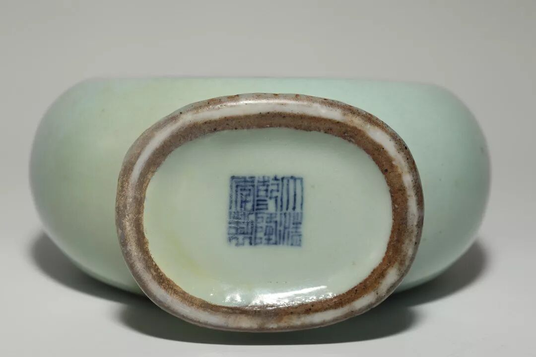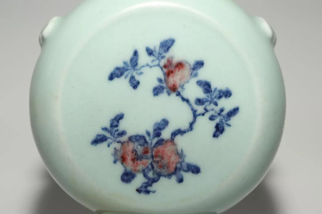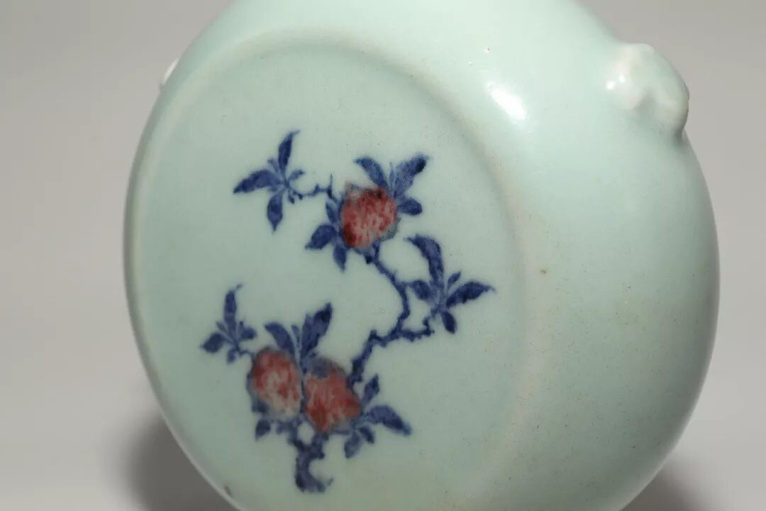 此青花釉里红豆青釉三多纹抱月瓶,古雅精巧、灵空秀美,通体胎釉豆青色,釉面光泽,整器淡雅柔和。唇口圆润,瓶颈细直,瓶身扁平而瓶腹圆硕,形若满月,瓶肩饰有蝙蝠纹,玲珑精致,瓶底座线条流畅、一气呵成,整体视觉效果古雅而不失秀美。